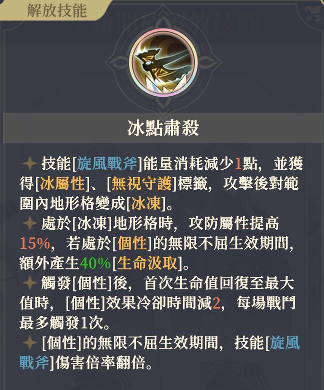 スキル[旋風戦斧]のエネルギー消費が1点減少し、[冰屬性]、[無視守護]のタグを獲得する、攻撃後、範囲内の地形マスが[冰凍]になる。