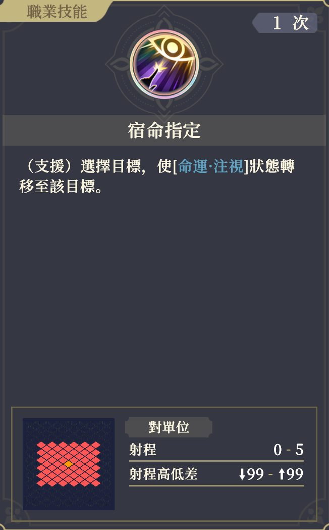 (支援) [即時]、任意のキャラクターに[命運・注視]を付与し、その後スキルは[命運・轉動]に変わる。