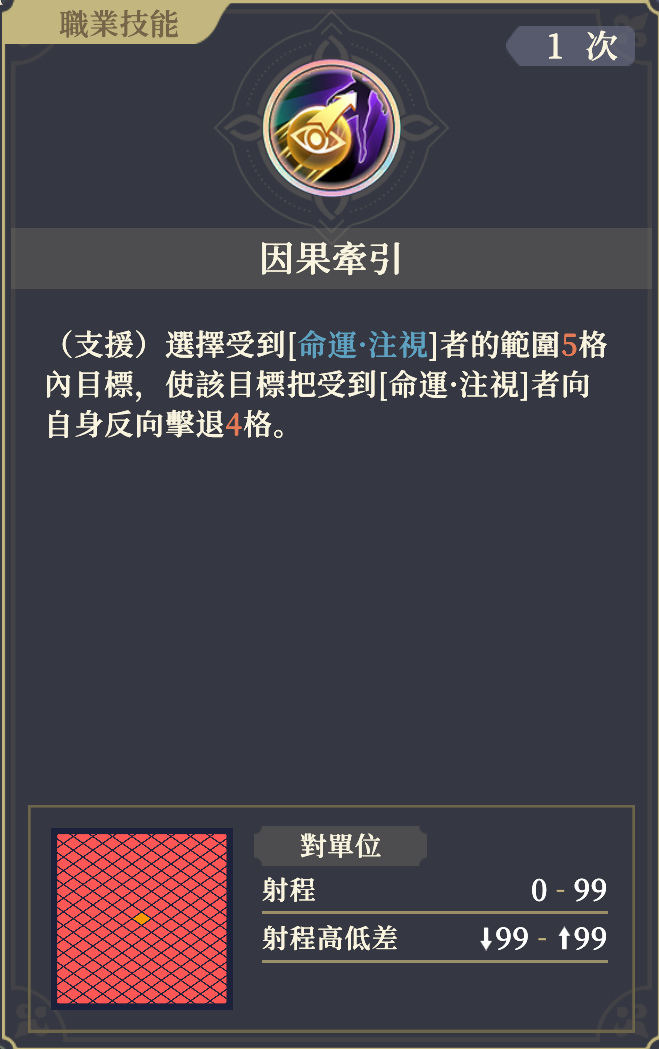 - 因果牽引:マーカーから5マス以内のユニットを指定し、その方向へマーカー対象を4マス引き寄せる