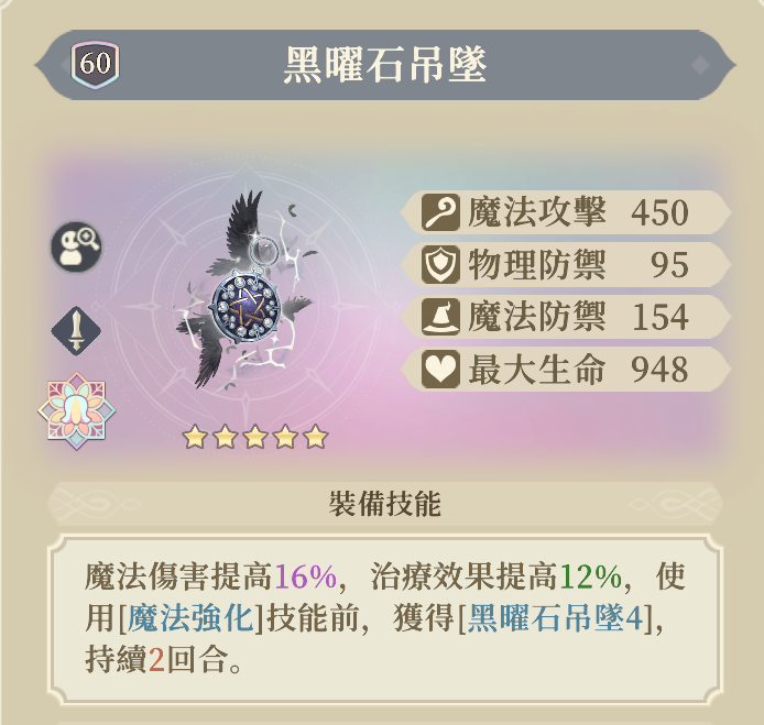 モチーフは魔法ダメージ+32%と数値は悪くないがユニーク効果があるわけではない。他のキャラに流用すると後半部分が発動しないから+16%止まりで絶対欲しいとまでは言えない。専用と割り切ってイェネファーとともに愛でたいとか、限定品という部分に価値を見出せるならあり。