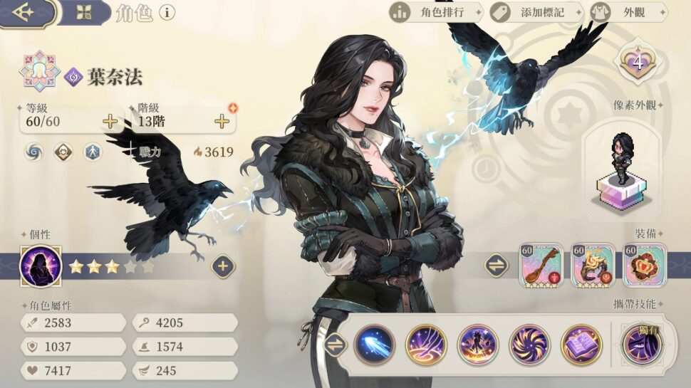 ウィッチャー3コラボの中でおそらく最も確保優先度が高いと言われている美魔女(原作はもっとタフな感じだった)。高レベルの支援スキルをマルチに使いこなし、味方に使えるテレポートも持っている(しかも行動順が速い)ので戦術スキル枠を他に使える点が好感された。半面、突出した一芸を持っているわけではないためトップ層に食い込むにはあと一歩及ばない印象。性能的にどうしても欲しいというわけではないが、複数編成を出撃させるイベントなどではベンチにいてくれると心強いだろう。