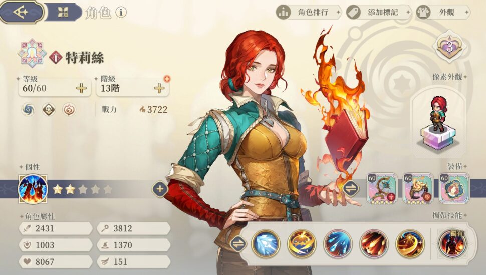 ウィッチャー3コラボ4人衆の中でいちばんクセ強なのがトリス。火の魔法と氷の魔法を操る…ところまではいいのだが、それを適切なタイミングで撃たないとダメージが最大化しないという制約がある。具体的には「燃焼パネルの上にいる敵に氷属性の攻撃をする」または「凍結パネルの上にいる敵に火属性の攻撃をする」ことが必要であり、これを自身だけで満たそうとするとやや面倒。トリスを使う際はいずれかの属性攻撃を持つ味方を同時に入れ、トリスの行動前に地形を燃やしたり凍らせたりできれば動きやすくなるだろう。火ならルヴァタやルトフィが候補。氷はシモーヌなど周回遅れのキャラが多いが、本国でコラボ終了後に開催されるルチア編でおそらく氷フィーバーが起きるのでそれに期待か。問題はそこまでしても出力はそれほどでもない点。使っていて面白いといえば面白いのだが、ぶっちゃけ強いキャラを求めるなら引かなくていいと思う。オートでも使えないし。