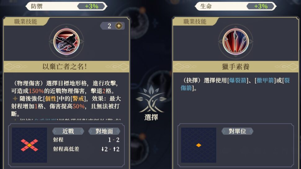 ◆ 遠距離攻撃時、攻撃+0,0,10,10,15%。[警戒]攻撃時、攻撃+0,0,10,10,15%。