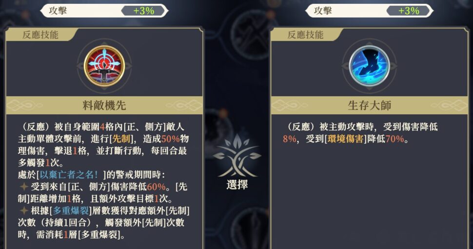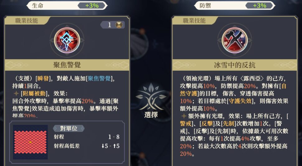 ターン外攻撃時、会心率が20%上昇する。[聚焦警覺]効果によって追加ダメージを与える場合、会心率がさらに20%上昇する。