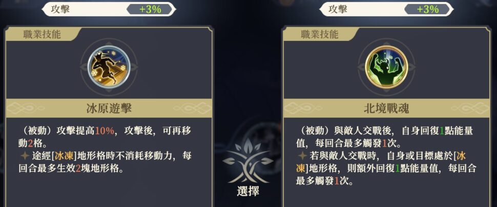[冰凍]地形マスを通過する際、移動力を消費しない。1ターンにつき最大2マスまで有効。