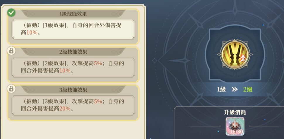 (パッシブ)[Lv3効果]攻撃+5%、自身のターン外ダメージ+20%。