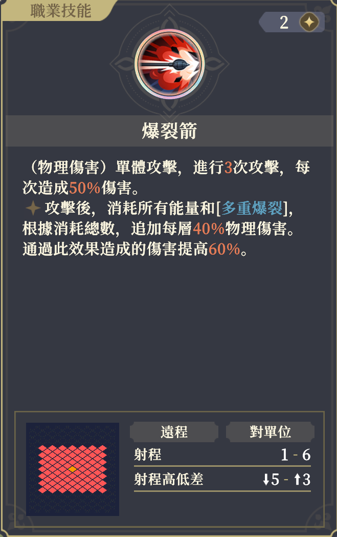 攻撃後、すべてのエネルギーと[多重爆裂]を消費し、消費した総数に応じて、1層ごとに40%物理ダメージを追加する。この効果によって与えるダメージは60%上昇する。
