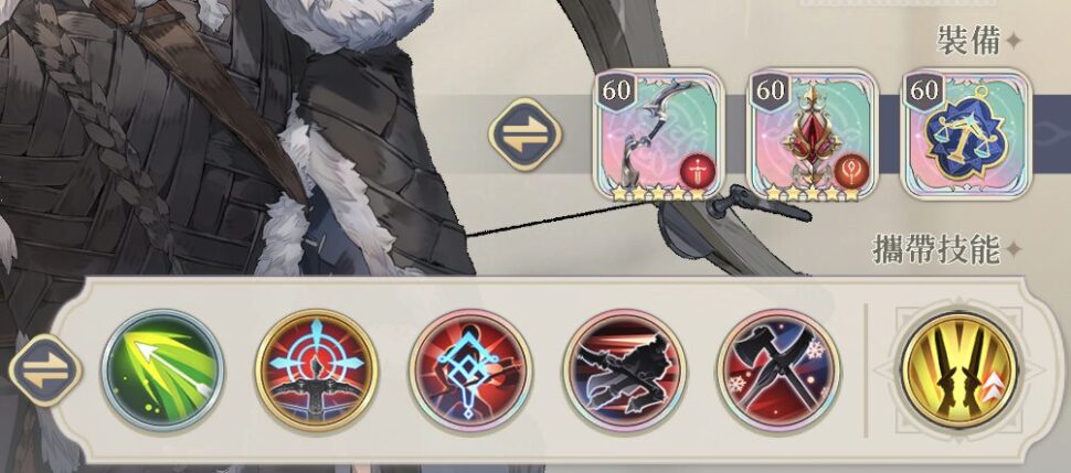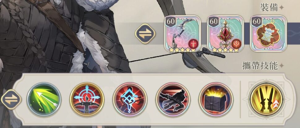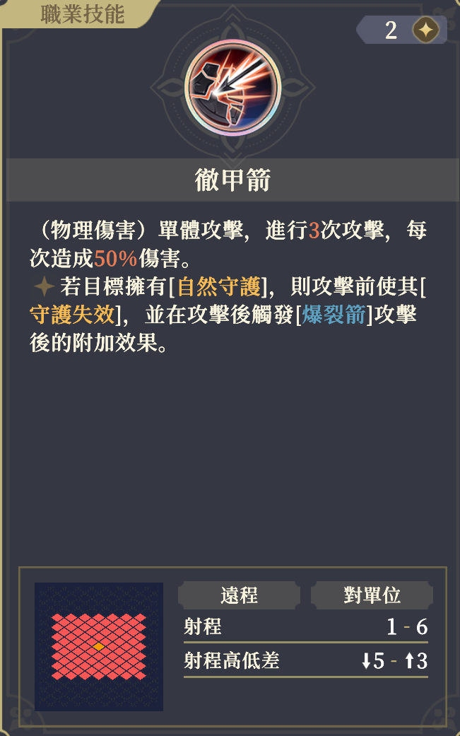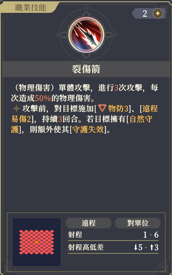 特に有用なのが裂傷箭。物防-3と遠距離被ダメ増という効果に加え、守護失効を与えて自然守護を打ち消してしまう。自前で無視守護を持たない非ルチアの味方も戦闘に参加させることができるようになる。爆裂/徹甲は多重爆裂を全消費して火力を出す代わりに警戒回数を増やせない。使い分けに注意。