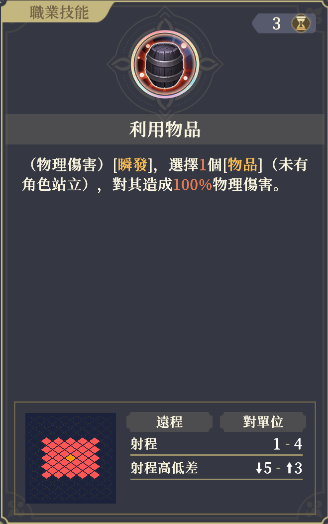 (物理ダメージ)自身の十字範囲内の敵1体を選択し、120%のダメージを与え、2マスノックバックする;
