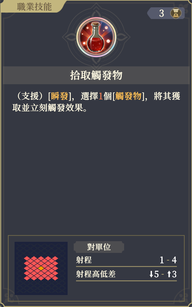 ◆ 行動終了時、[警戒]状態でない場合、自身範囲4マスに[強制警戒]を実行し、2回35%のダメージを与える。警戒は毎ターン最大2回まで誘発。
