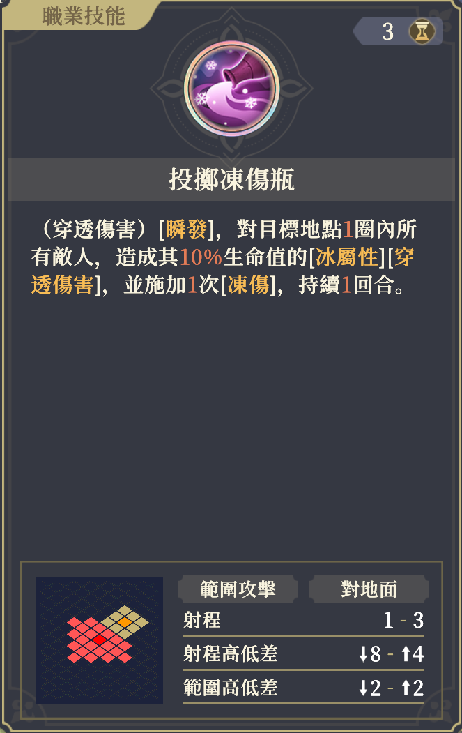 (貫通ダメージ) [即時]、目標地点1周内の全ての敵に、その10%のHPの[冰屬性][貫通ダメージ]を与え、1回[凍傷]を付加する(1ターン)。