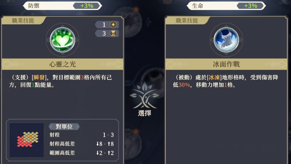 (パッシブ)[凍結]地形マスにいる時、受けるダメージが30%減少し、移動力が1マス増加する。