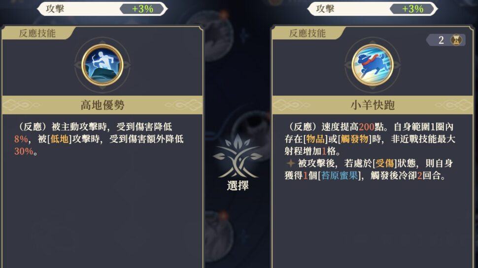 (反応)能動攻撃を受けた時、受けるダメージが8%減少する。[低地]から攻撃された場合、さらに受けるダメージが30%減少する。