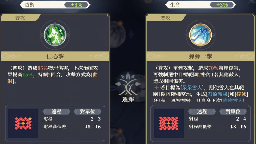 (選択)[重堆一個]、[滾滾雪球]、[修築工事]のいずれかを選択して使用する。いずれかのスキルを使用するとクールダウンに入る。