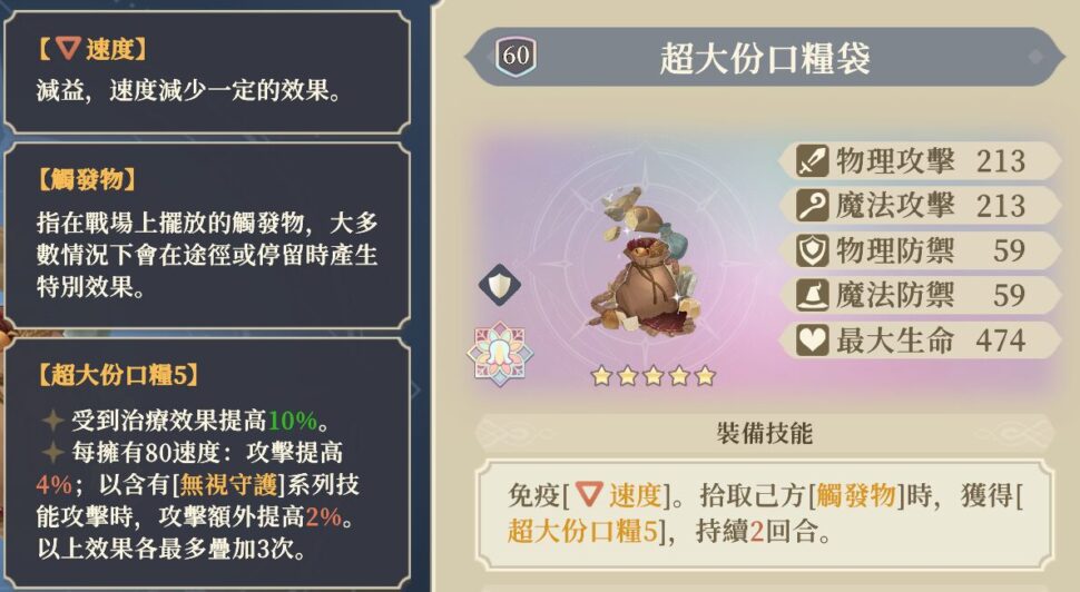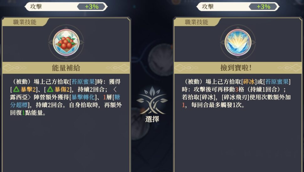 (パッシブ)味方が[苔原蜜果]を拾得した時:[▲暴擊2]、[▲暴傷2]を獲得(2ターン持続)。〈ルチア〉陣営はさらに[暴擊轉化]と[糖分超標]1層を獲得(2ターン持続)。自身が拾得した場合、さらにエネルギーを1回復する。