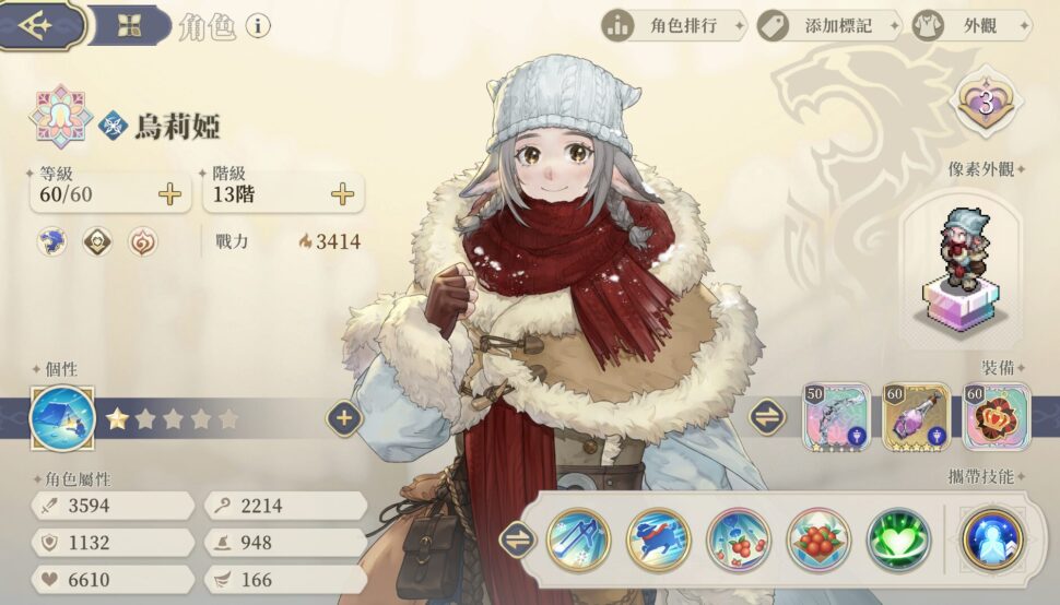 ユーリアは雪だるまを設置し、あとはフルーツを味方へ投げつけて回復とバフをかけるだけの役割。クリティカル率+60%とクリダメ+45%。速度バフは+150、と数値を見れば突出している。おまけでジェネリック苦薬(被弾時に30%回復)もついてくる。