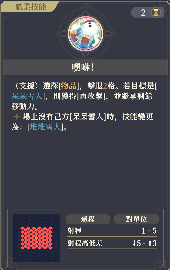 (支援)[物品]を選択して2マスノックバックする。もし対象が[呆呆雪人]の場合は[再攻撃]でき、余剰移動力を引き継ぐ。
