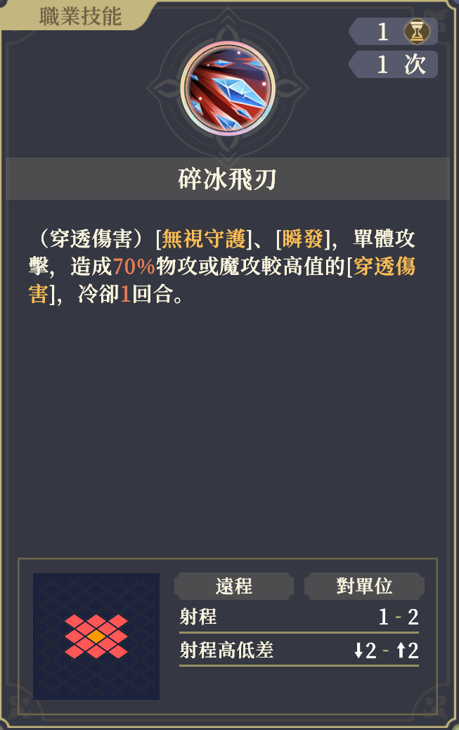 [砕冰飛刃]を発動する時、貫通ダメージが10%上昇し、残りの使用回数をすべて消費して、その回数に応じてダメージ倍率を上昇させる。