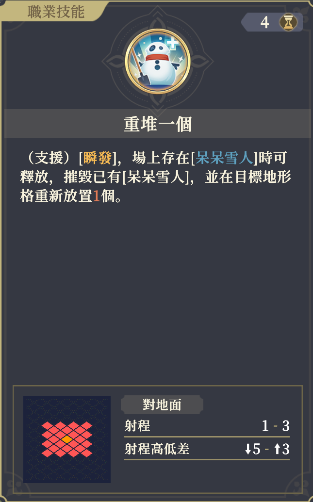 (支援)[瞬発]場に[呆呆雪人]が存在する場合に発動可能。既存の[呆呆雪人]を破壊し、目標の地形マスに新たに1体配置する。