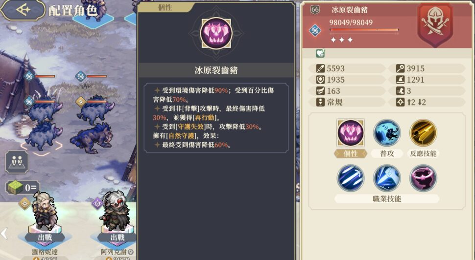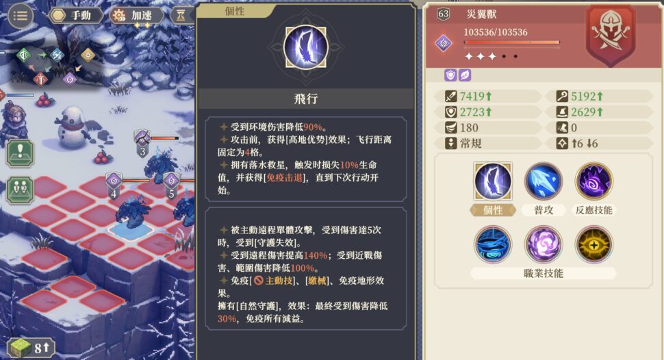 よく見かける雑魚、災翼獣。ダメージカット効果がズラズラと並び、近接と範囲攻撃が通らない。デバフも地形ダメージも効かない。通るのは遠距離単体ダメージのみ。さらに5回遠距離単体ダメージを本体に入れないと守護が割れない。(守護の効果と対策は敵ごとに異なる)